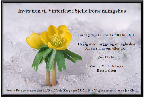 Vinterfest i Sjelle Forsamlingshus 2018 Udgivet i 05/03/201806/03/2018 af admin Der afholdes vinterfest i Sjelle Forsamlingshus lørdag den 17. marts